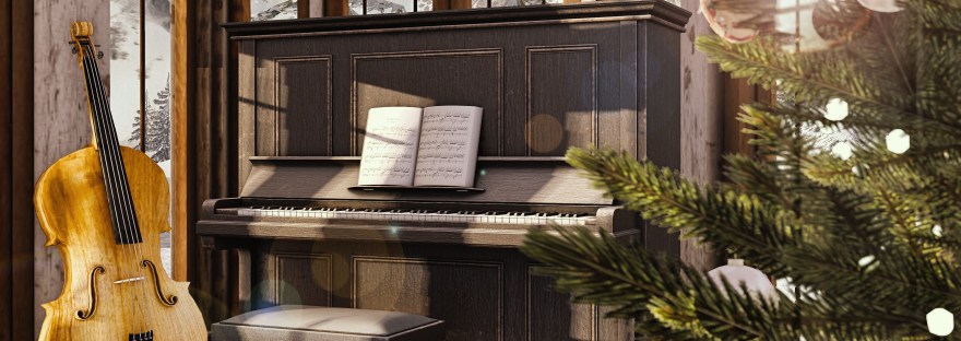 Dark wood standing piano with open sheet music and bench ready for sitting.