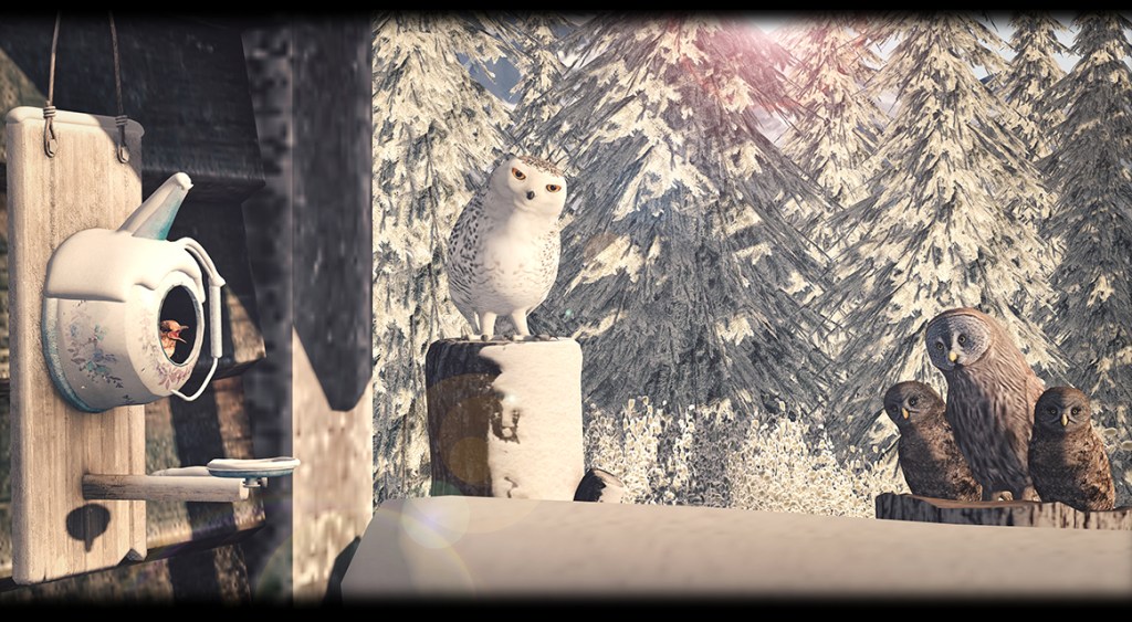 │T│L│C│Great Grey Owl family including tree stump, 3 LI/bird + 1LI/stump, copy modify.