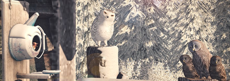 │T│L│C│Great Grey Owl family including tree stump, 3 LI/bird + 1LI/stump, copy modify.