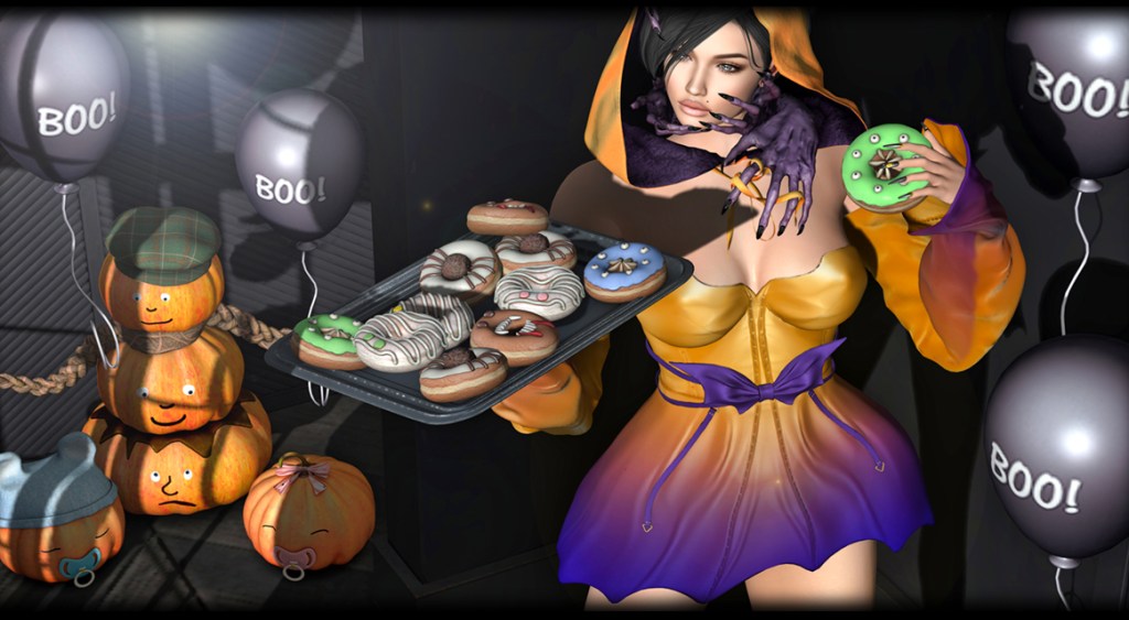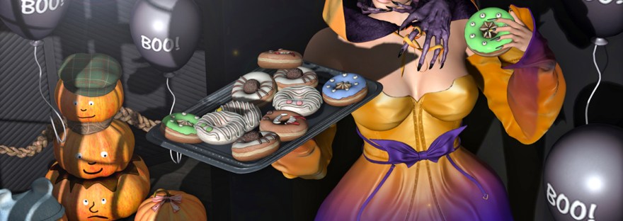Included in this pack is a wearable donut tray/giver that will give one of five wearable donuts (blue, green, mummy, spider, vampy) to anyone who clicks. There is also a rez-able version of the tray, as well as non-animated donuts to rez out, if you wish.